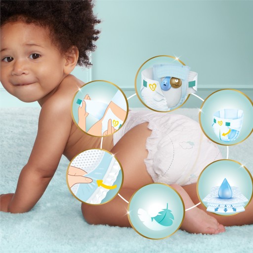 Komfortowa miękkość Pampers dzięki MILIONOM MIKROPORÓW, które utrzymują rzadką kupkę z dala od skóry 3) WYJĄTKOWO MIĘKKI MATERIAŁ otula skórę dziecka, zapewniając mu komfort i ochronę. Oraz 4) nasz unikalny wzór COMFORT FIT z nakładającym się systemem zapinania