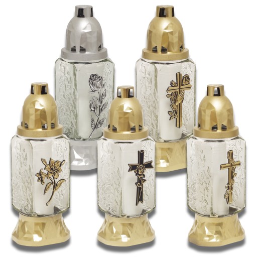 ZNICZE NA GRÓB SZKLANE PARAFINOWE RÓŻNE WZORY 25cm Z WKŁADEM 28h